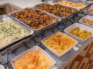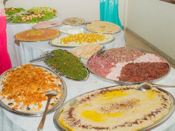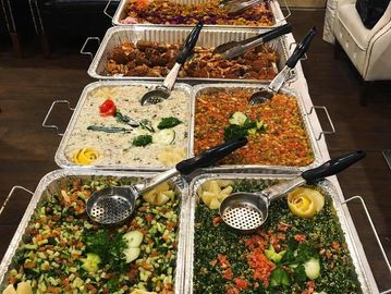 Chicken Kabob / Kafta Kabob / Rice / Hummus / Mediterranean Salad / Cucumber Yogurt Salad / Garlic Sauce / Pita Bread / Grape Leaves / Kibbeh / Cheese Pie / Veggie Roll / Falafel / Baklava.